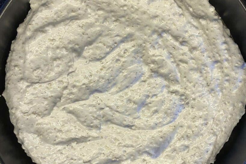 Visu rūpīgi samīca viendabīgā, mīkstā mīklā. Bļodu pārklāj ar dvieli un liek siltā vietā uz apmēram 1 stundu, lai mīkla uzrūgst un kļūst gaisīgāka.