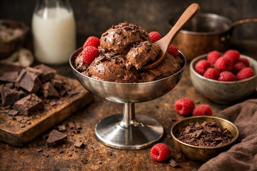 Atdzesēto šokolādes masu lieciet saldējuma mašīnā. Tālāk rīkojieties saskaņā ar pagatavošanas instrukciju. Gatavais kārums jāuzglabā cieši noslēgtā traukā saldētavā. Piecas minūtes pirms pasniegšanas izņemiet saldējumu no ledusskapja un ļaujiet tam nedaudz atkust.