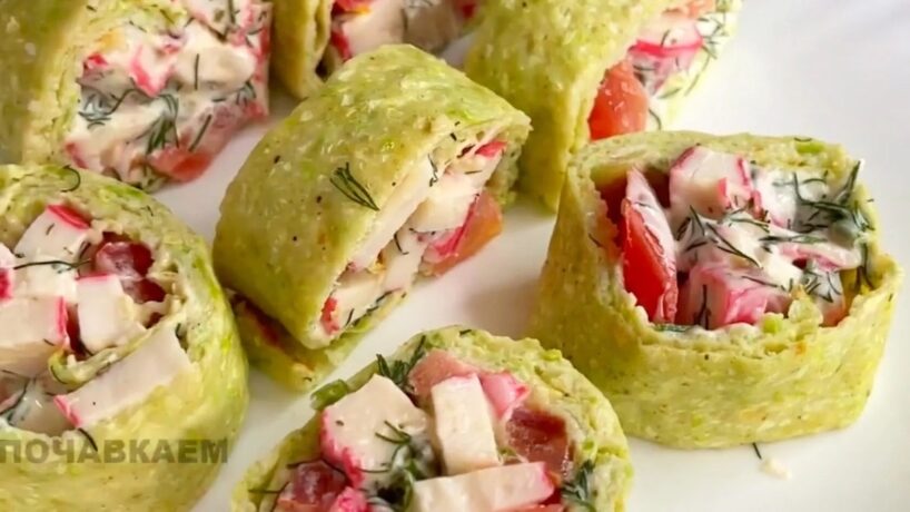 Varat tos pildīt arī ar gaļu, krabju nūjiņām, gurķi — visu, ko varat atrast. Vienkārši sarullējiet tos, sagrieziet šķēlēs, un tie ir gatavi 10 minūšu laikā.