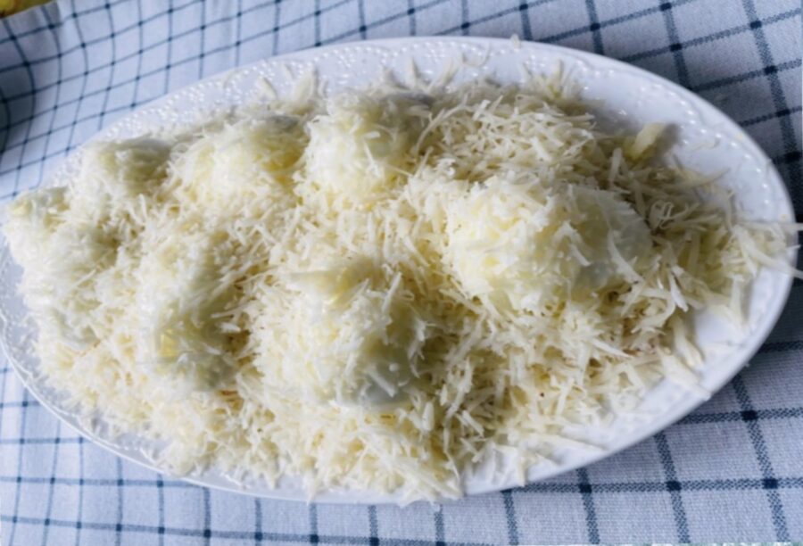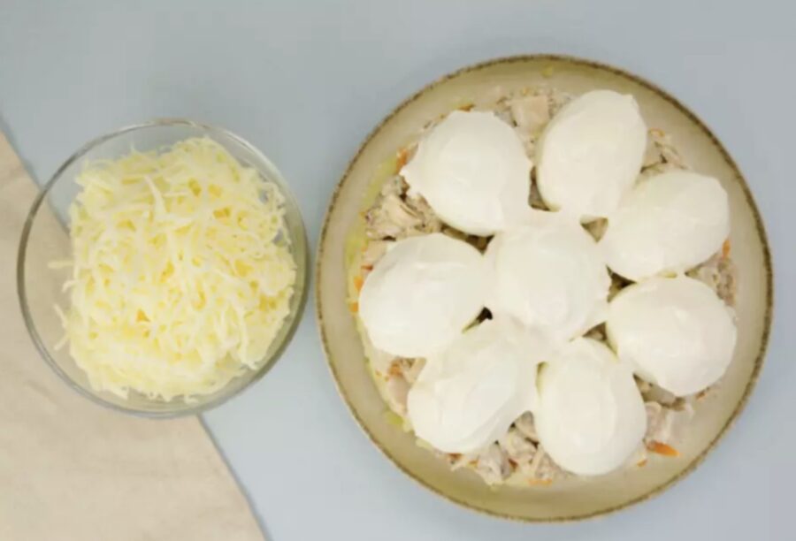 Tagad ķersimies pie “sniega” kārtas! Sarīvējiet sieru uz pašas smalkākās rīves – vislabāk izvēlēties gaišu šķirni, lai tas vairāk atgādinātu īstas kupenas. Tagad uzmanīgi apsmērējiet visus salātus ar majonēzi, neaizmirstot arī par olu pusītēm. Noslēgumā visu bagātīgi apkaisiet ar rīvēto sieru. Gatavs!