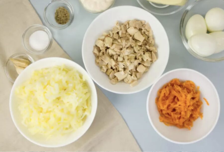 Kad kartupeļi un burkāni ir atdzisuši, sarīvējiet tos uz rupjās rīves. Savukārt vistas fileju vienkārši sagrieziet mazos kubiņos, lai tā ēdienā labāk sadalītos.