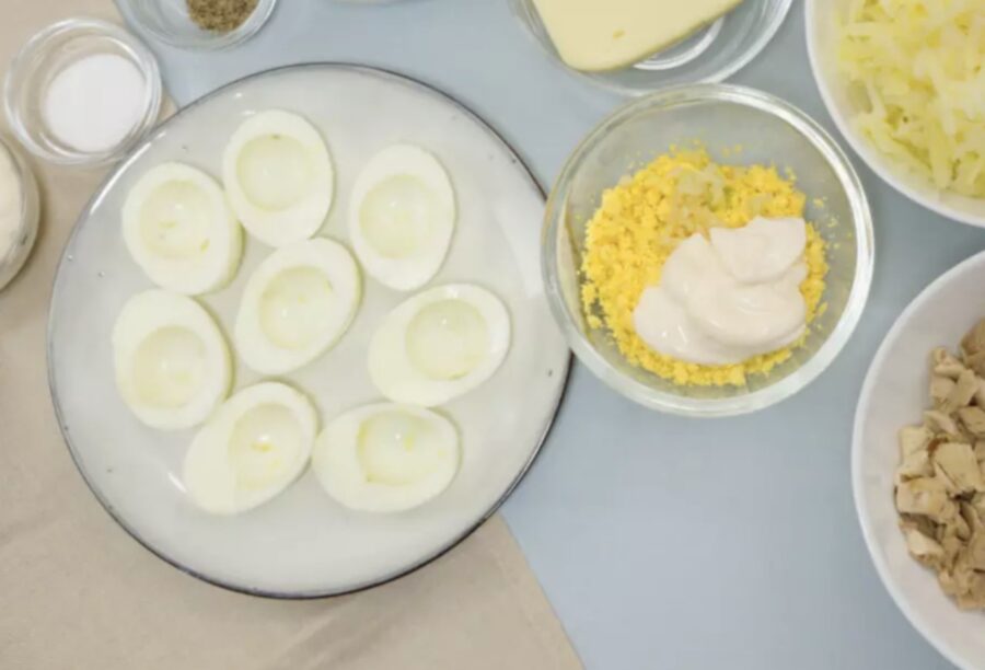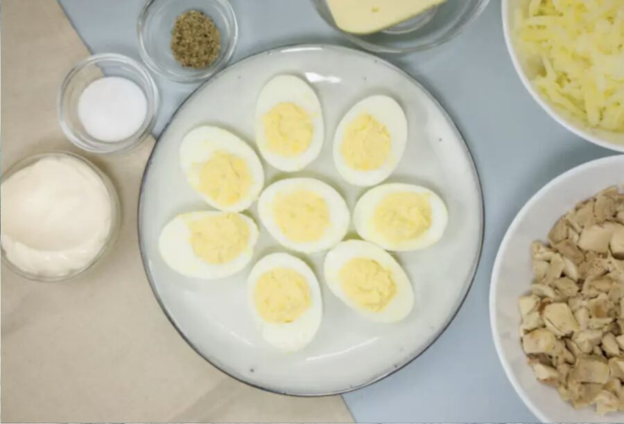 Vispirms nolobiet vārītās olas. Pēc tam pārgrieziet tās uz pusēm un uzmanīgi atdaliet olbaltumus no dzeltenumiem. Dzeltenumus ielieciet bļodā un kārtīgi saspaidiet ar dakšiņu – jāiegūst mīksta masa.