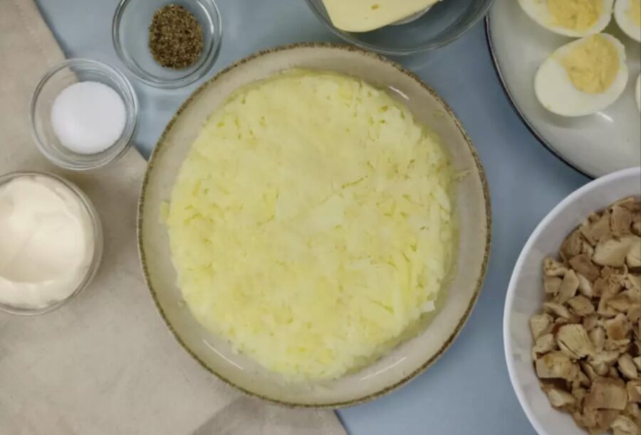 Paņemiet skaistu, plakanu šķīvi. Izklājiet uz tā sarīvētos kartupeļus un nedaudz piespiediet ar dakšiņu, lai kārta būtu līdzenāka. Tagad uzmanīgi pārsmērējiet to ar majonēzi – tā būs gan garšīgi, gan skaisti!