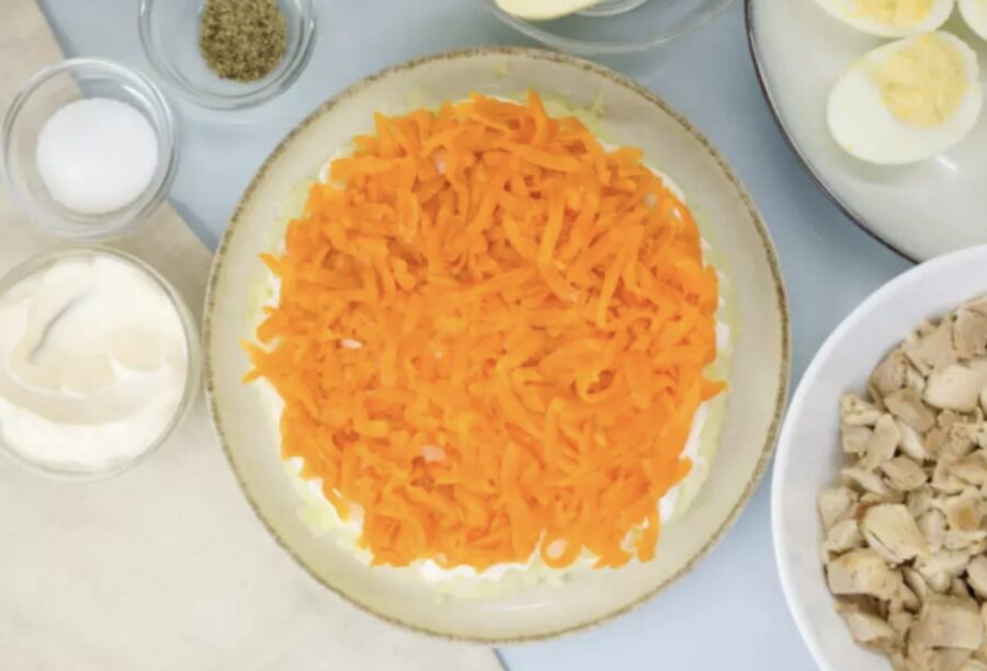 Tagad kārtosim slāņus! Vispirms rīvētie burkāni. Pa virsu uzklājiet majonēzes sietiņu. Pēc tam seko vistas gaļa, tikai neaizmirstiet to iepriekš sajaukt ar nelielu daudzumu majonēzes, kā arī pievienot sāli un piparus.