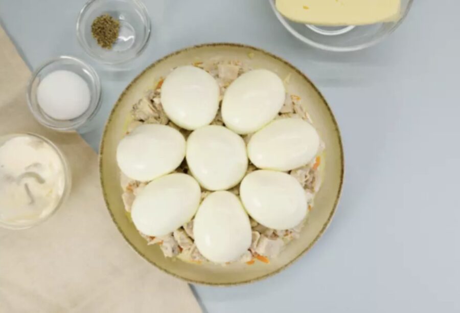 Tagad izrotāsim salātus ar olām! Paņemiet olu pusītes un novietojiet tās ar griezuma vietu uz leju. Septiņus gabaliņus uzmanīgi izkārtojiet aplī – lai to “deguntiņi” būtu vērsti uz centru. Bet pašā centrā novietojiet astoto pusīti. Tik vienkārši tiek izveidots skaists noformējums!