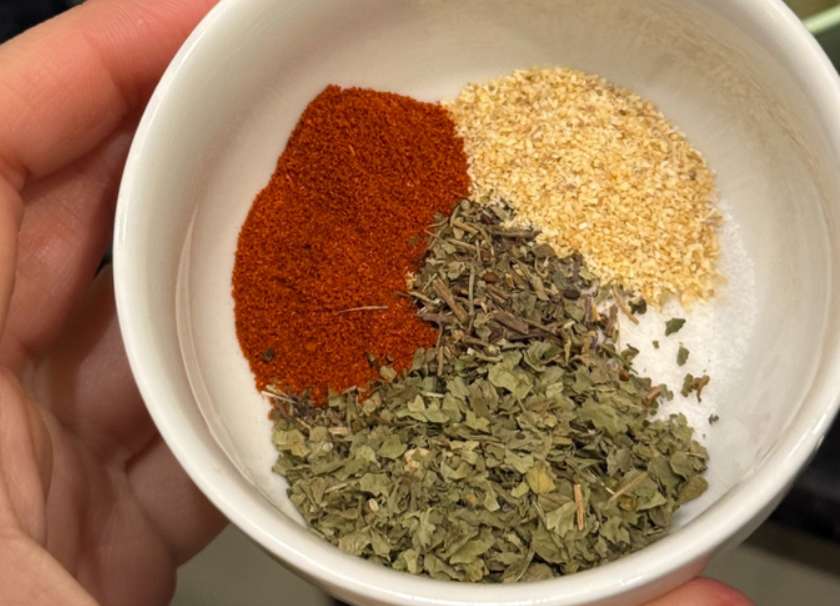 Man bija: sausais ķiploks, paprika un sausie aromātiskie garšaugi (baziliks un vēl kaut kādi, es aizmirsu 😂)
