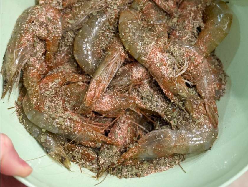 Apkaisām garneles ar garšvielu maisījumu un kārtīgi samaisām, lai katra garnelīte būtu pārklāta ar “marinādi”. Reizēm es varu pievienot arī citronu sulu vai sojas mērci, bet šoreiz gatavoju tikai ar garšvielām. Atstājam marinēties burtiski uz 10-15 minūtēm istabas temperatūrā.