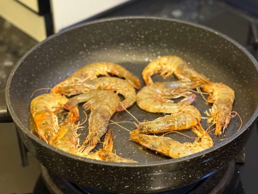 Tikmēr ņemam pannu, ielejam tajā augu eļļu un uzkarsējam uz stipras uguns (var arī uz vidējas, bet tuvāk stiprai, tomēr garnelēm ir jācepas).