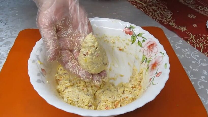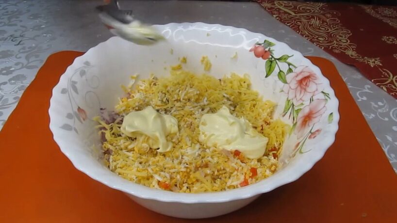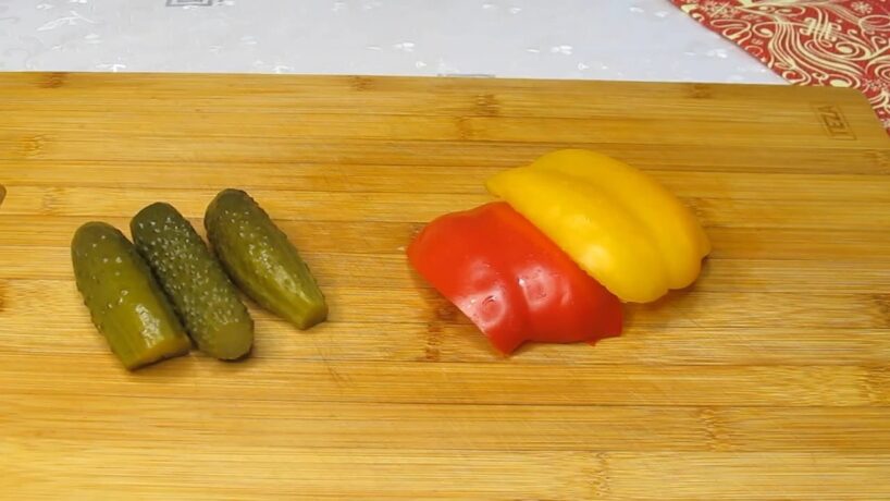 Sālītos gurķus arī sagriežu nelielos gabaliņos, cenšoties, lai tie pēc izmēra būtu līdzīgi vistas filejai. Vārītās olas un cieto sieru sarīvēju uz vidējas rīves, jo tieši šāda tekstūra ļauj masai kļūt gaisīgai un viegli formējamai.