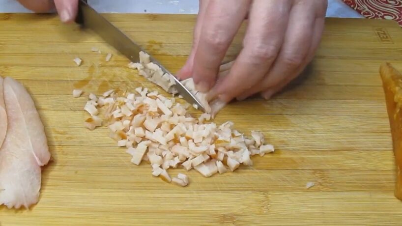 Vispirms sagatavoju vistas fileju, pārliecinoties, ka tā ir pilnībā atdzisusi pēc vārīšanas. Tad to sagriežu ļoti smalkos kubiņos, lai masa būtu viendabīga.