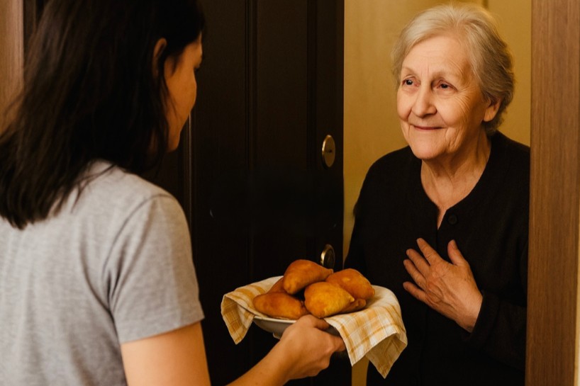 Kaimiņiene iznāca. Slaucīja rokas pret priekšautu. No dzīvokļa smaržoja pēc kaut kā garda — mājas ēdiena.