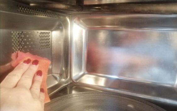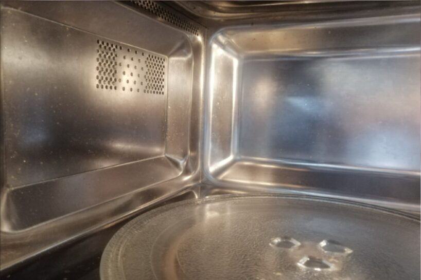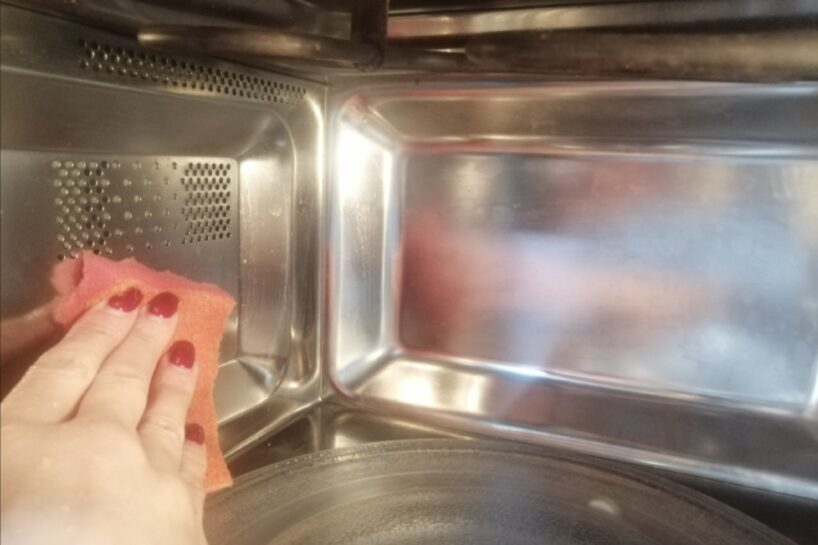 Paņemam tās pašas pusi glāzes ūdens, bet citrona vietā ūdenī pielejam pāris ēdamkarotes parastā galda etiķa. Ieslēdzam uz 3–5 minūtēm pilnā jaudā.