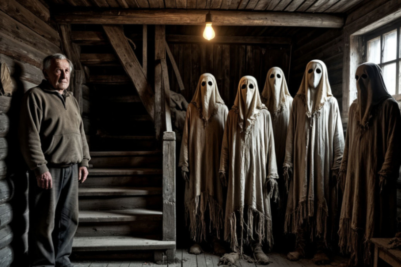 Nokāpis lejā, es apraudzījos. Pagrabs bija pārsteidzoši liels un tīrs. Gar vienu sienu stāvēja plaukti ar burkām, gar otru — tie paši kartupeļu maisi. Bet trešā siena… Gar to rindā stāvēja piecas cilvēka auguma figūras, galvas pārvilktas ar biezu pelēku maisaudumu.