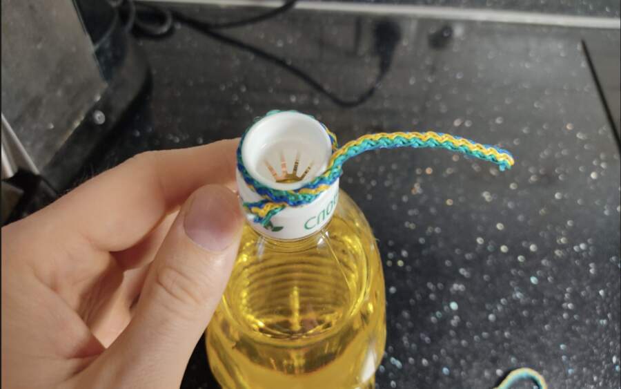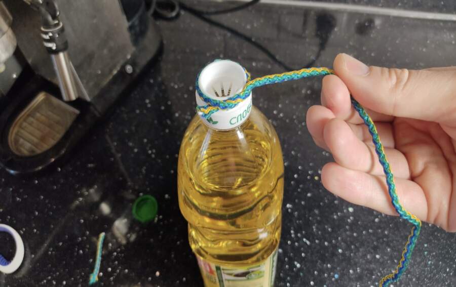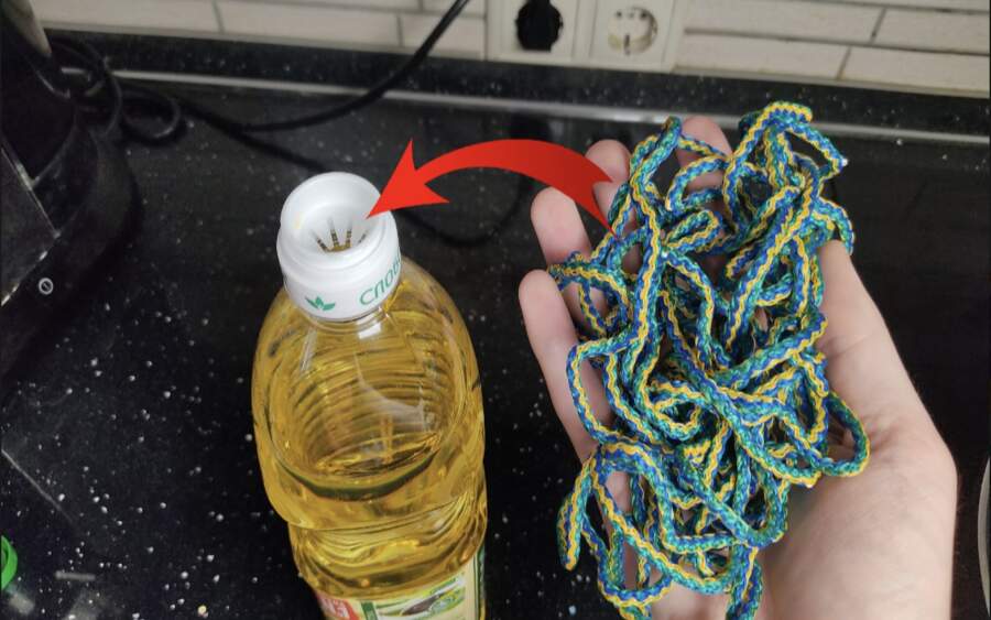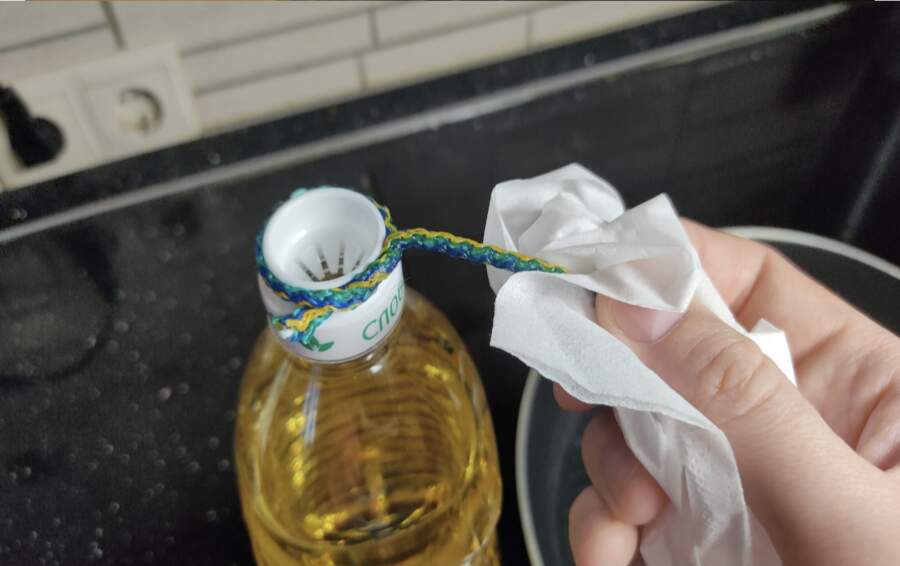 Senā metode paredzēja eļļas pudeles kakliņa lejasdaļā cieši aptīt parastu kokvilnas diegu vai tievu aukliņu. Šķietami sīka detaļa, taču tai ir ļoti praktiska nozīme – diegs kalpo kā barjera un “uzsūcējs”, kas neļauj taukainajam pilienam aizceļot līdz pudeles apakšai.