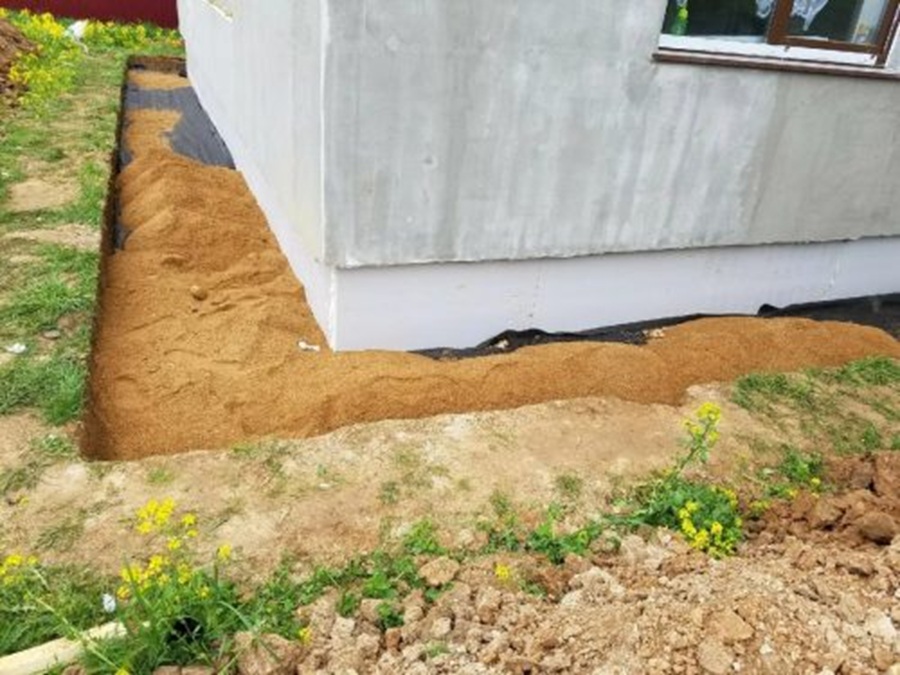 Ģeomembrāna vai blīva izolācija: Zem zemes virskārtas slīpi prom no pamatiem tiek ieklāta speciāla plēve vai siltumizolācijas materiāls, kas neļauj ūdenim piekļūt pie pamata pēdas.