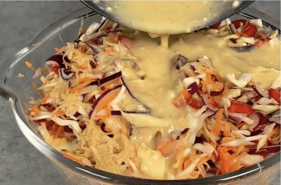 Kamēr dārzeņi bļodā gaida, es pagatavoju mērci jeb aizdaru. Citā bļodā iesitu četras olas un tās viegli sakuļu. Pievienoju sāli, piparus, četras ēdamkarotes eļļas un četras ēdamkarotes piena. Pēc tam pakāpeniski iemaisu miltus, cieti un tējkaroti cepamā pulvera. Kad masa ir viendabīga, es to vienkārši pārleju pāri dārzeņiem un visu rūpīgi samaisu.