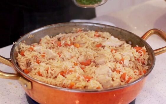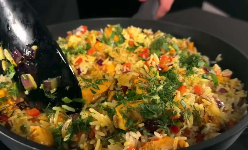 4. Vāriet rīsus, vistu un dārzeņus pannā ar vāku – kamēr rīsi ir mīksti! Pirms pasniedzat katram porciju, sasmalciniet zaļumus un pārberiet pāri.