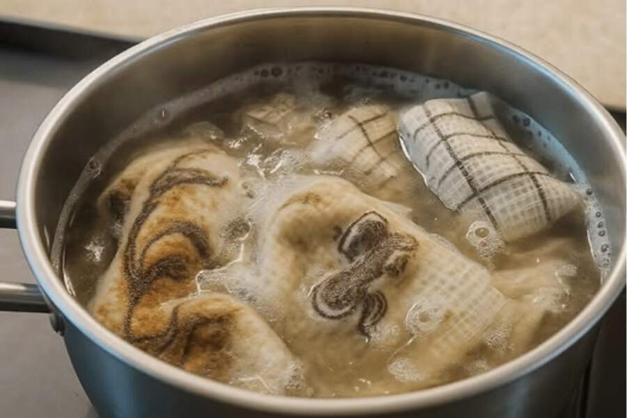 Trauku liek uz plīts un uzkarsē līdz vārīšanās temperatūrai. Nav nepieciešams tos vārīt stundām ilgi, kā to darīja kādreiz. Pietiek ar pāris minūtēm, kad šķidrums ir sācis burbuļot. Karsēšanas laikā dvieļus vēlams dažas reizes apgrozīt, izmantojot koka karoti vai knaibles. Jūs uzreiz pamanīsiet, kā ūdens kļūst tumšāks, bet dvieļi sāk izskatīties gaišāki.