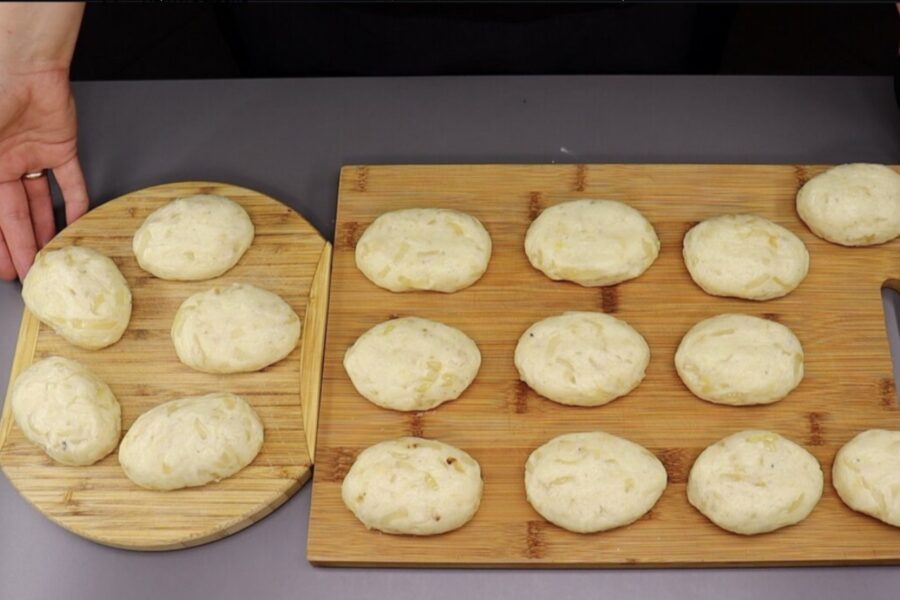 Kad kartupeļi kļuvuši patīkami silti, tos sarīvē uz rupjās rīves un sajauc ar sīpolu un siera maisījumu. Pievienojot miltus, masa kļūst stingra un padevīga. No šāda sastāvdaļu daudzuma parasti izdodas pagatavot aptuveni 16 kotletes.
