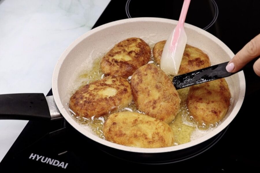 Cepšana notiek uz vidējas uguns pietiekamā eļļas daudzumā. Kotletes cep no abām pusēm, līdz tās iegūst pārliecinoši zeltainu un apetītlīgu nokrāsu. Pateicoties tam, ka kartupelis jau ir iepriekš termiski apstrādāts, cepšanas laiks nav ilgs – pietiek vien ar dažām minūtēm no katras puses.