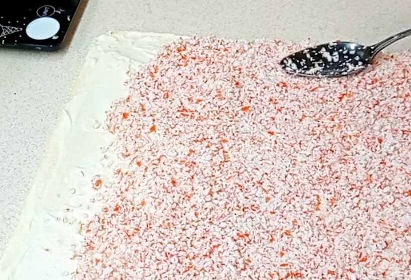 Pāri sieram lieku krabju nūjiņu masu, bet tālākajā malā atstāju 3–4 cm tukšu vietu. Tas palīdzēs ruleti skaisti sarullēt.
