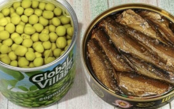 2.No šprotēm notecina eļļu, zivi sagriež gabaliņos un pievieno kartupeļiem. Tur ieber zirņus bez šķidruma.