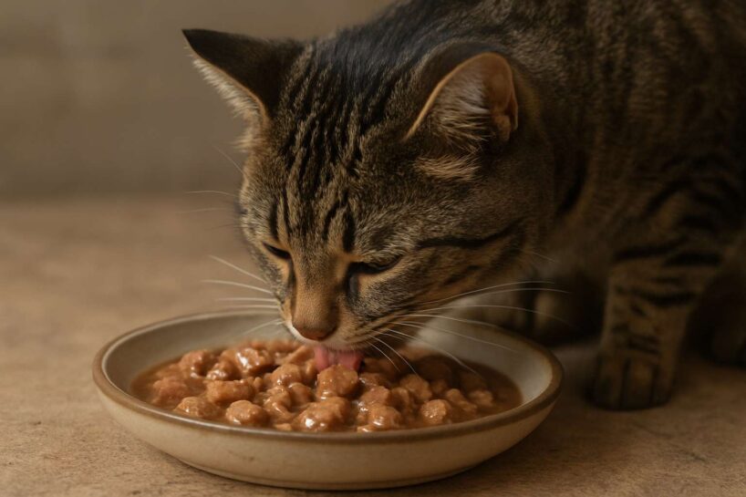 Arī kaķu uzvedībai ir sava loma. Ja dzīvnieks nav ļoti izsalcis, tas izvēlas visgaršīgāko – šķidro daļu – un atstāj ēdienu “vēlākam laikam”. Tomēr mitrā barība ātri izžūst un zaudē aromātu, tāpēc kaķim vairs nav intereses pie tās atgriezties. Dažiem dzīvniekiem var būt neērti ēst gabaliņus no dziļas bļodas – to traucē ūsas vai pats trauka veids. Citi reaģē uz trokšņiem, citu dzīvnieku klātbūtni, vides maiņu. Tas viss var ietekmēt ēšanas kvalitāti. Kaķis izvēlas mērci, jo tā smaržo, bet gabaliņi ir “tukši”. Tā nav kaprīze — tā ir instinktīva reakcija uz sastāvu.