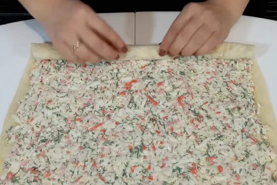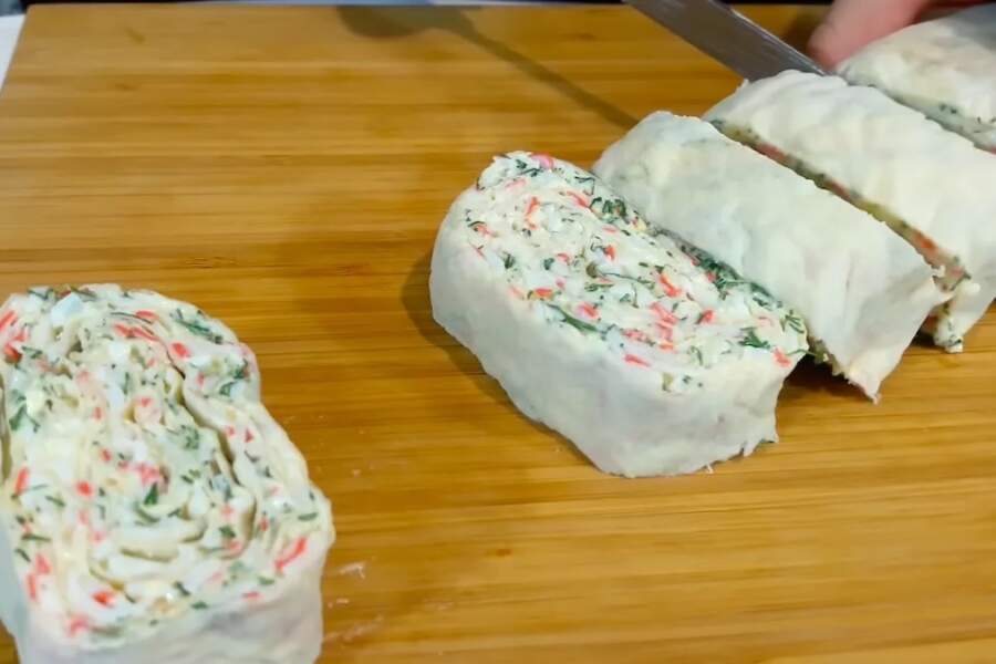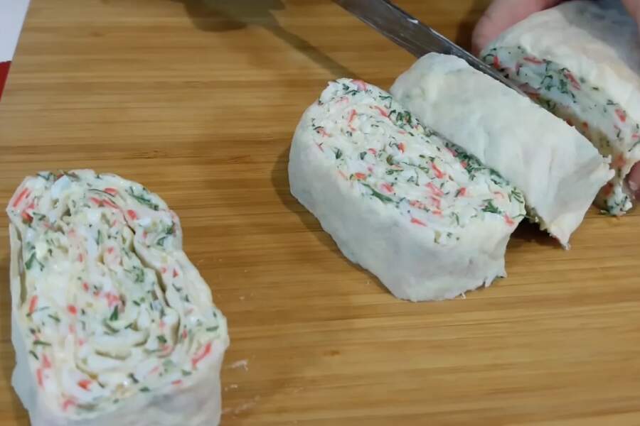 Lavaša rullete ar krabju nūjiņām un kausēto sieru ir vienkārša uzkoda, ko var ātri pagatavot gan ikdienas vakariņām, gan svētku galdam.