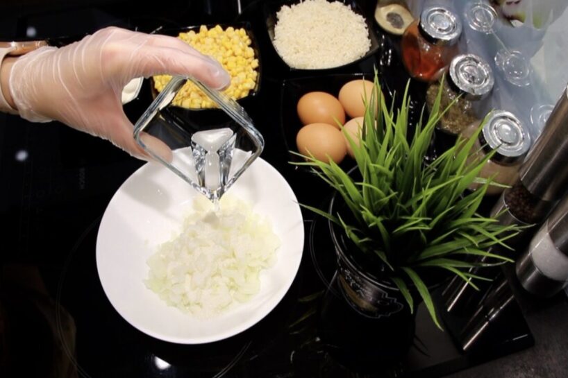 Smalki sagriežam vienu sīpolu. Atsevišķā bļodā sajaucam 2 ēdamkarotes cukura un 3 ēdamkarotes etiķa.