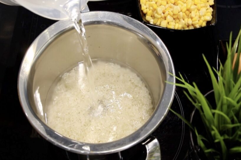 Ieberam 180 g rīsu katlā. Pielejam ūdeni tā, lai ūdens līmenis būtu aptuveni par 1 cm virs rīsu līmeņa. Nedaudz pievienojam sāli.