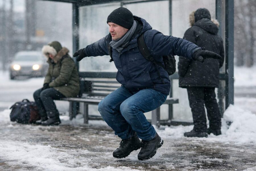 Ja kājas zābakos ir pārvērtušās par ledus gabaliem, varat sarīkot mini treniņu turpat uz vietas. Sāciet veikt ātrus, sīkus lēcienus, it kā lēktu ar neredzamu lecamauklu, cenšoties pārvelt svaru no papēža uz purngalu un atpakaļ. Jau pēc minūtes apavi vairs nešķiet akmens auksti, pēdas sāk degt, un jūs vienlaikus gan sildāties, gan nedaudz izkustaties, kamēr pārējie vienkārši stāv un salst.