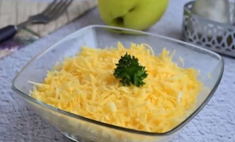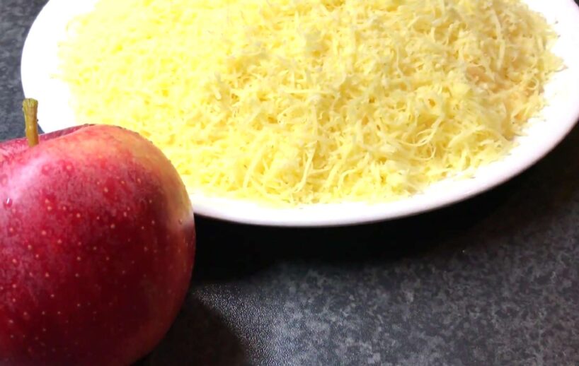2. Ja veikalā nenopirkāt jau sarīvētu sieru, tad ņemam rīvi un to rīvējam uz smalkās rīves. Pēc tam nomizojam ābolus, izņemam sēkliņas un rīvējam tos uz rupjās rīves. Pēc tam ābolus apšļakstam ar citrona sulu un samaisām.