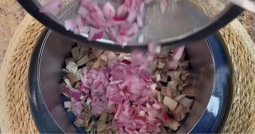 Lai salāti izdotos maigi un saskanīgi, svarīgi ir nesteidzīgi un uzmanīgi sagatavot katru sastāvdaļu. Vispirms uzmanību vērts pievērst sīpolam, jo tieši tas piešķir salātiem patīkamu svaiguma noti. Izmanto sarkano sīpolu, kas ir maigāks un saldāks par baltajiem, to sagriež plānās šķēlītēs un īsu brīdi pamarinē ūdenī ar šķipsnu sāls, cukura un nelielu daudzumu etiķa. Šāds sīpols kļūst daudz maigāks un piešķir salātiem patīkamu līdzsvaru, nepadarot tos pārāk asus.