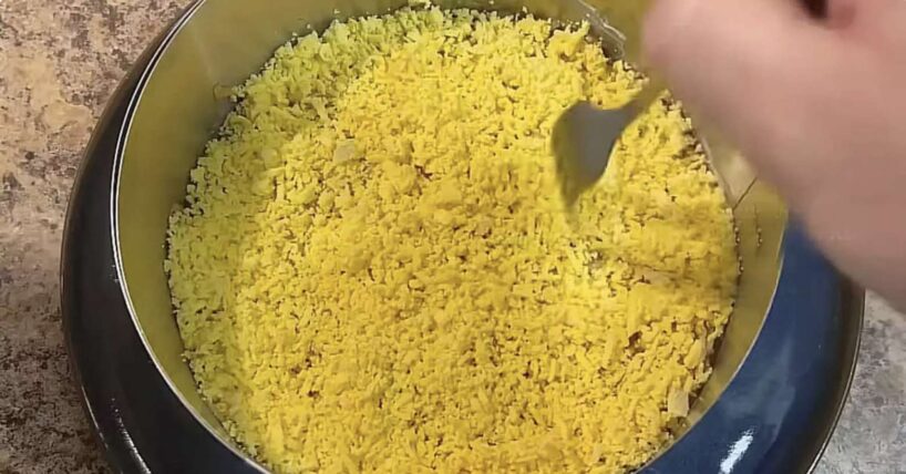 Tālāk nāk olu kārta. Olas novāra cieti, pēc tam atdala dzeltenumus no baltumiem. Dzeltenumus sarīvē smalki un vēlāk izmanto vidējā slānī, bet baltumus atliek pašā beigās, lai tie kalpotu par “sniega segu”. Olas piešķir salātiem maigu struktūru un patīkamu līdzsvaru starp sālīgo zivi un saldeni skābo ābolu.