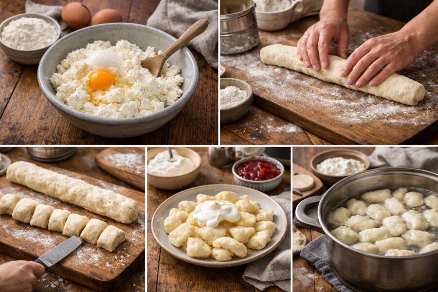 Galvenā atšķirība no klasiskajām — nav nepieciešama ilga veidošana. Mīkla no biezpiena un miltiem tiek izrullēta “desā” un pēc tam vienkārši sagriezta porciju gabaliņos. Viss darbs aizņem aptuveni 15 minūtes, un uz galda ir gardas, sātīgas un veselīgas brokastis vai vakariņas.