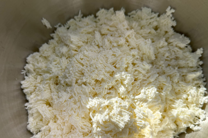 🔥 Biezpienu ņemam 9%, ne mazāk, ideāli der tas, kas ir briketēs — tas ir pietiekami sauss. Ja tavs biezpiens ir mitrs un tajā ir pārāk daudz sūkalu, pakar to marlē uz 1–2 stundām, lai šķidrums notek.