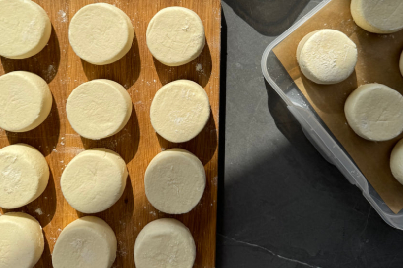 Lai iegūtu ideālu izskatu, nosver vienādus gabaliņus — pa 60 g katru, viegli apviļā miltos un, izmantojot nazi un roku, izveido apaļu plācenīti.