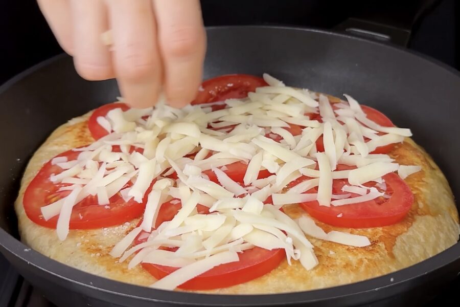 Pašās beigās visu bagātīgi pārber ar rīvētu sieru. Pannai noteikti uzliek vāku un noregulē pavisam mazu uguni. Zem vāka siers ātri izkusīs, bet tomāti sasils. Pietiek ar pāris minūtēm, līdz siers kļūst staidzīgs un sāk patīkami smaržot. Tortilja pa to laiku no apakšas būs kļuvusi cieta un kraukšķīga kā picas pamatne.