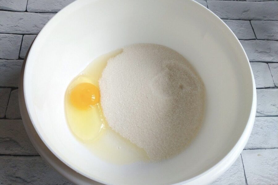 Sākumā bļodā iesit olu un pieber cukuru. Nav jādzenas pēc stingrām putām, pietiek, ja ar slotiņu tos vienkārši sajauc kopā. Tad lej klāt kefīru un eļļu. Atkal nedaudz pamaisa, lai masa kļūst vienmērīga.