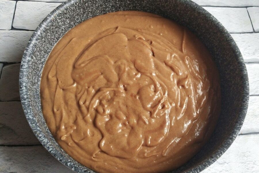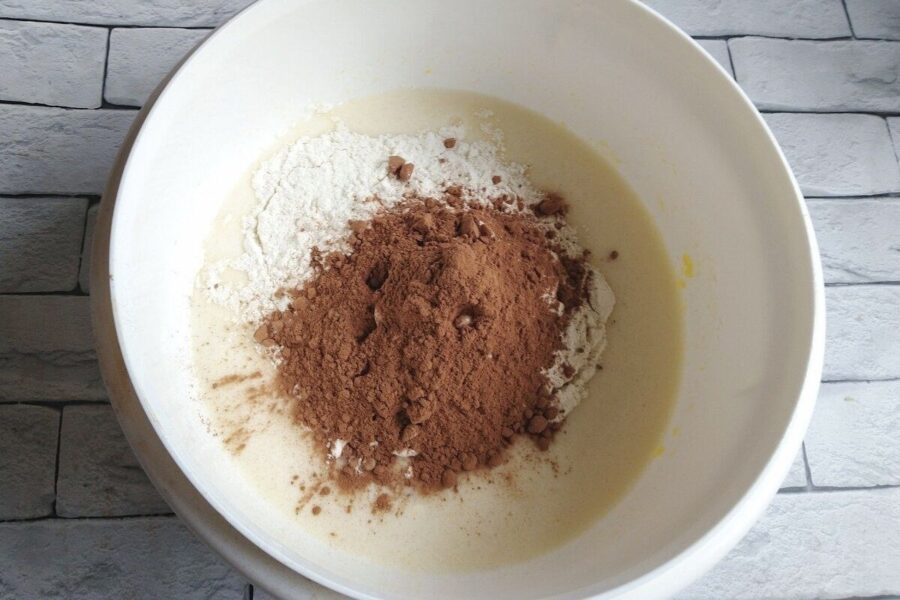 Nākamais solis ir sausās sastāvdaļas. Es parasti miltus un kakao iesijāju tieši bļodā, lai nav kunkuļu, bet var arī vienkārši iebērt un kārtīgi izmaisīt. Pievieno sodu un maisa, līdz mīkla kļūst gluda un spīdīga. Tai jābūt tādai diezgan šķidrai, līdzīgai biezam skābajam krējumam. Tā ir laba zīme – tas nozīmē, ka biskvīts būs mīksts.