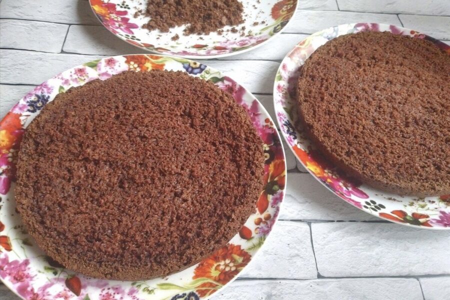 Kad biskvīts ir pilnībā atdzisis (tas ir svarīgi, citādi krēms izkusīs), tam nogriež pašu virsiņu – to nelīdzeno “cepurīti”. To nemet ārā, bet ar rokām sadrupini smalkās druskās. Tās vēlāk noderēs kūkas dekorēšanai.
