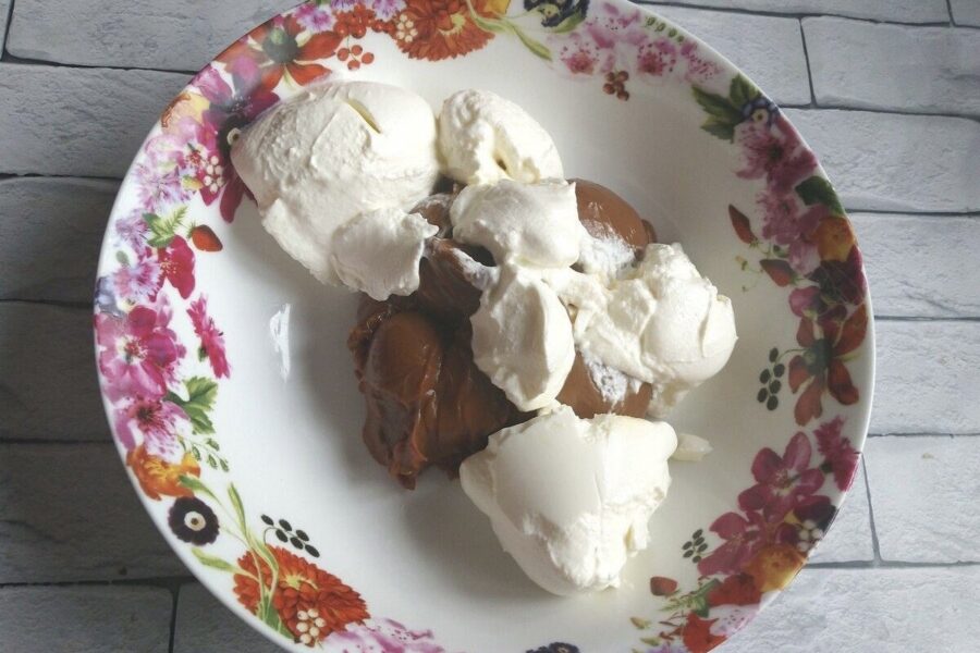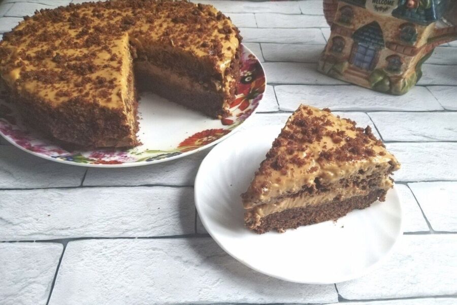 Kamēr biskvīts dziest, var pagatavot krēmu. Esmu mēģinājusi dažādus variantus, bet vislabāk pie šīs tumšās mīklas piestāv vārītā iebiezinātā piena un skābā krējuma apvienojums. Tas sanāk tāds karamelīgs, sātīgs un reizē ar patīkamu skābumiņu.