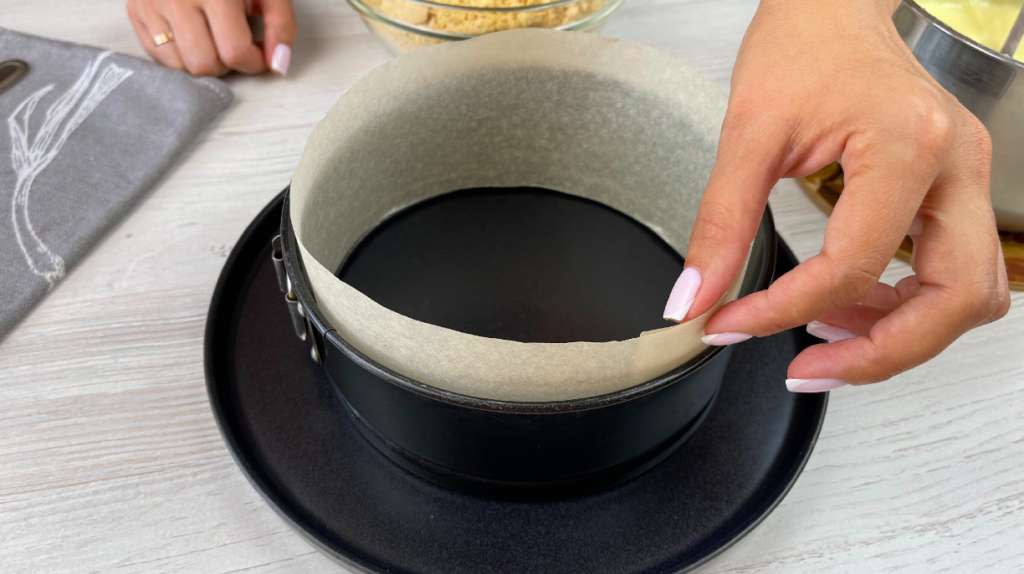 Lai kūka neliptu pie formas, nosedziet malas ar acetāta plēvi vai cepampapīru, kā parādīts fotoattēlā.