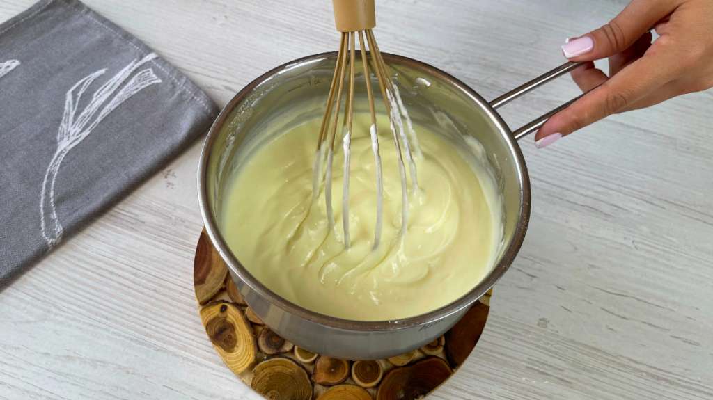 Vāra krēmu uz vidējas uguns, nepārtraukti maisot, lai nekas nepiedeg. Nebaidieties, ja maisījums karsējot sākotnēji kļūs šķidrs — procesa laikā tas noteikti sabiezēs.