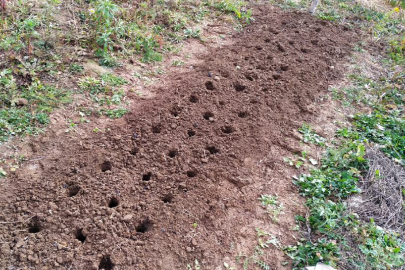 Rezultātā bedrītes sanāk glītas: dziļums — 7 cm, attālums starp tām — 13 cm. Ja daiviņas mazas, taisām nedaudz seklāk. Vienkārši, ātri un uzticami.