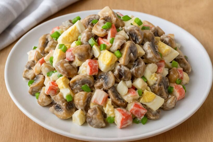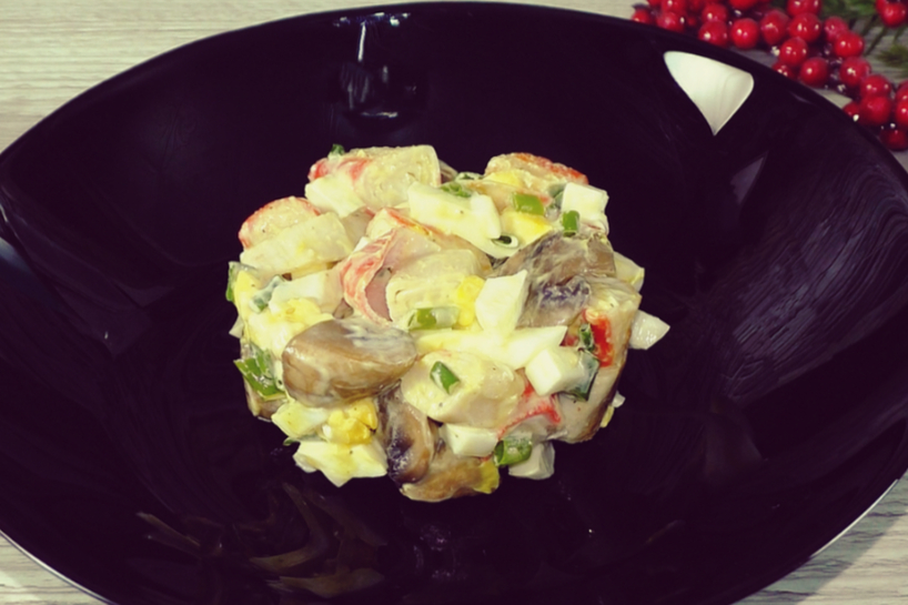 Izveidojas sātīgi, maigi un vienlaikus aromātiski salāti ar patīkamu sēņu un jūras velšu garšu. Apceptās krabju nūjiņas piešķir negaidītu noti, padarot šo ēdienu par īstu kulināru pārsteigumu.