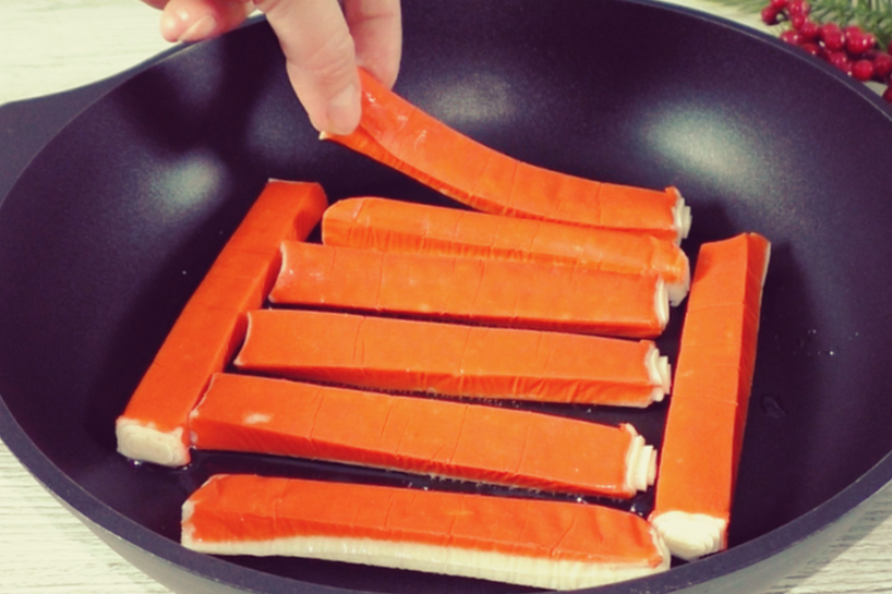 Vispirms pilnībā atkausējam krabju nūjiņas. Tas ir svarīgi, jo, ja tās būs vēl sasalušas, pannā tās izdala lieku šķidrumu un nesanāks panākt zeltainu garoziņu. Uzkarsējam pannu uz vidēji stipras uguns un pievienojam tikai vienu ēdamkaroti augu eļļas — ar to pilnīgi pietiek, jo krabju nūjiņas neuzsūc daudz taukvielu. Izliekam tās pannā vienā kārtā un cepam no abām pusēm, līdz tās iegūst vieglu, zeltaini brūnu toni.