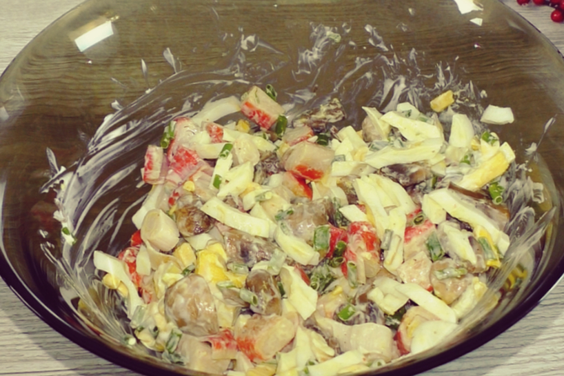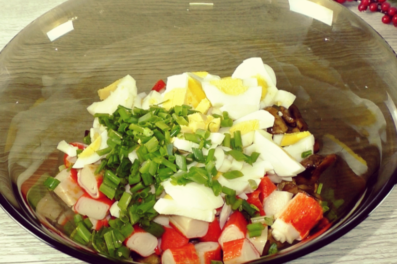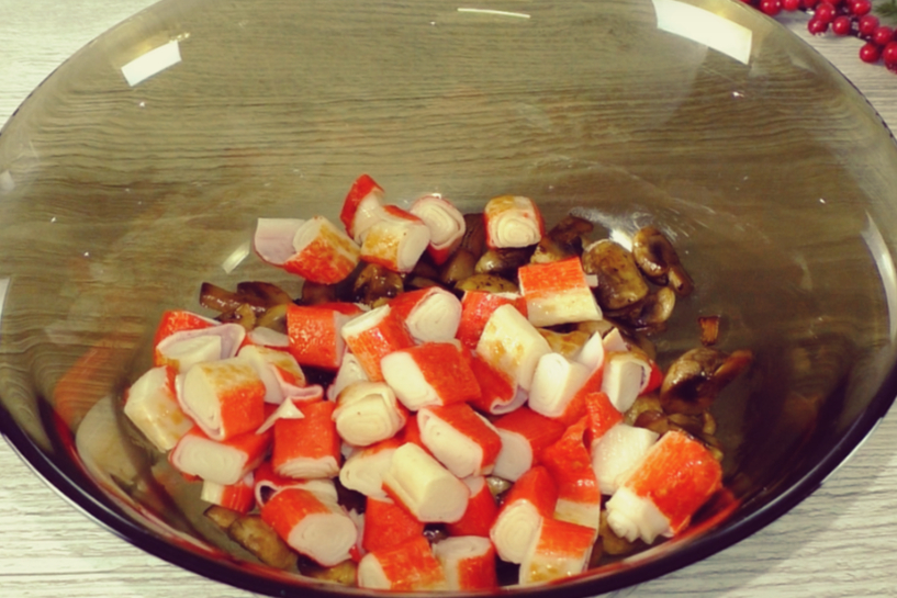 Pievienojam sēnēm krabju nūjiņas, kuras iepriekš sagriežam aptuveni tādā pašā lielumā kā sēnes. Šis vienādo gabaliņu izmērs padara salātu ne tikai vizuāli pievilcīgu, bet arī patīkamāku ēšanai.