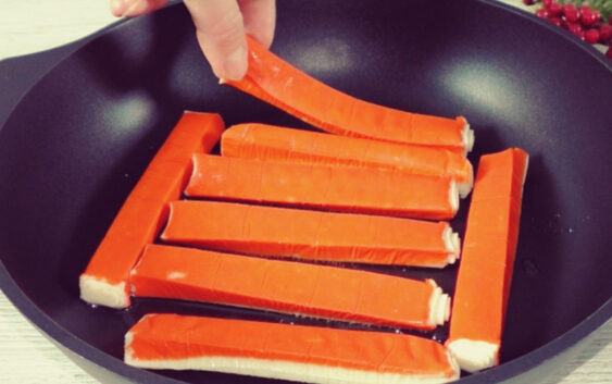 Vispirms pilnībā atkausējam krabju nūjiņas. Tas ir svarīgi, jo, ja tās būs vēl sasalušas, pannā tās izdala lieku šķidrumu un nesanāks panākt zeltainu garoziņu. Uzkarsējam pannu uz vidēji stipras uguns un pievienojam tikai vienu ēdamkaroti augu eļļas — ar to pilnīgi pietiek, jo krabju nūjiņas neuzsūc daudz taukvielu. Izliekam tās pannā vienā kārtā un cepam no abām pusēm, līdz tās iegūst vieglu, zeltaini brūnu toni.