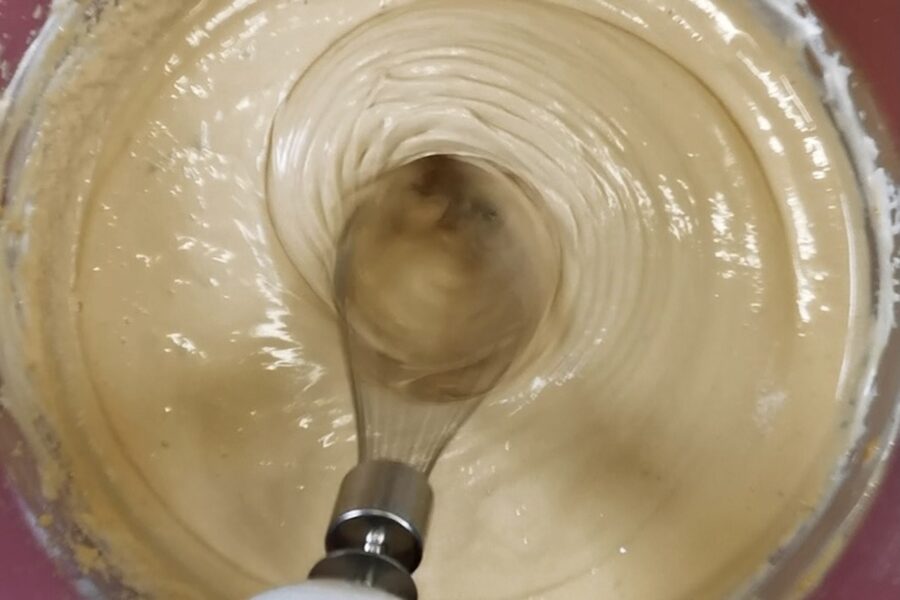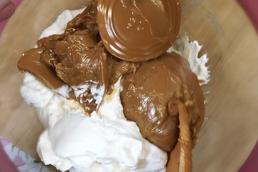 Traukā lieciet krējumu un iebiezināto pienu, un vienkārši sakuļat ar mikseri vai rokas putojamo slotiņu līdz viendabīgai, gaisīgai masai. Krēms garšo izcili – tam ir patīkams skābumiņa un salduma balanss.